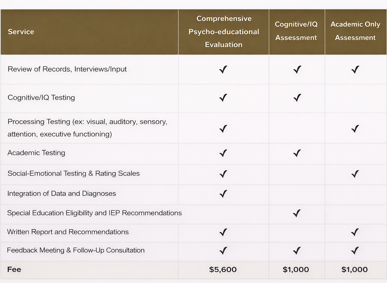 There are several types of assessments depending on your child’s needs. The chart below outlines what is included in each evaluation so you can easily compare services and determine which options best fits your goals.